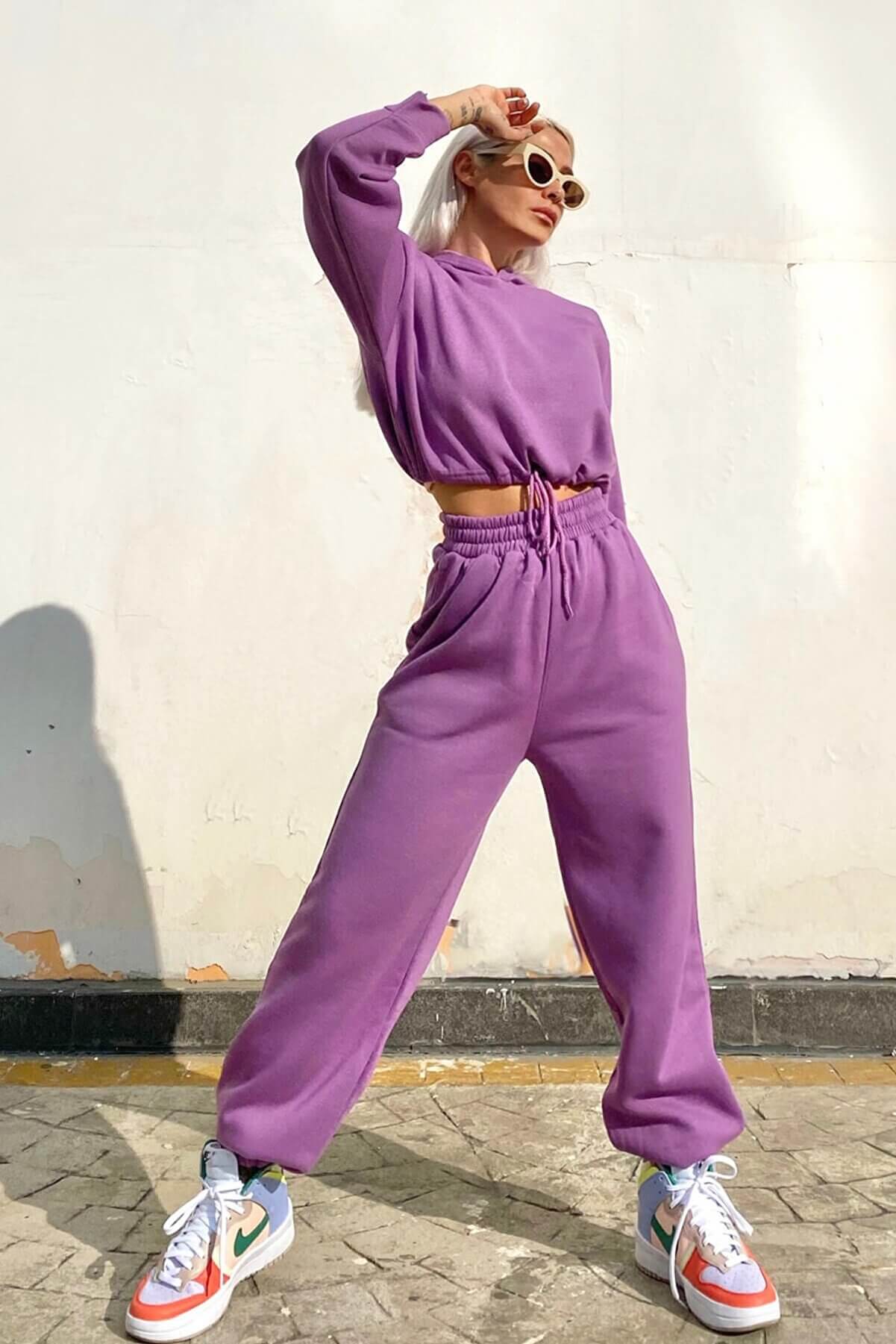 Mor Kapüşonlu İçi Pamuklu 3 İplik Eşofman Takımı